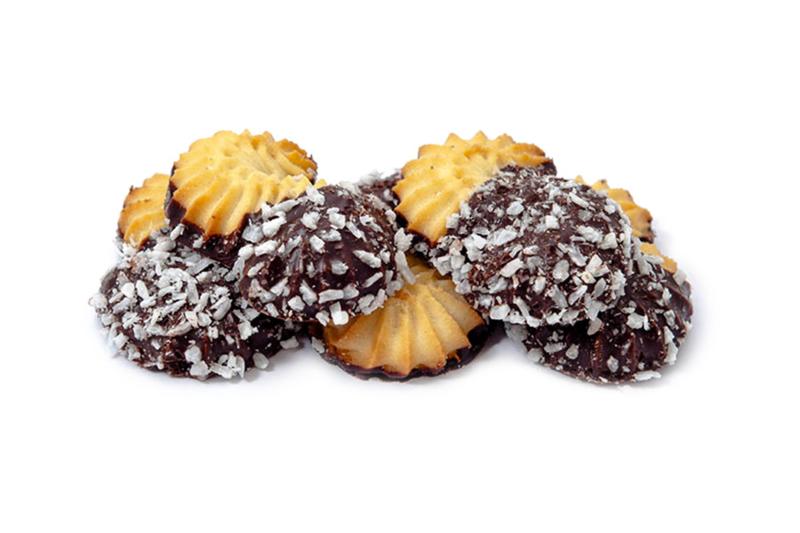 Smilšu mīklas cepumi ar īrisa - krējuma garšu, daļēji glazēti ar kakao glazūru un apkaisīti ar kokosriekstu skaidiņām. Struktūra - irdena.