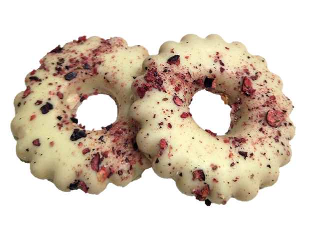 Gredzenveida smilšu mīklas cepumi, glazēti ar balto glazūru, apkaisīti ar žāvētām upenēm.