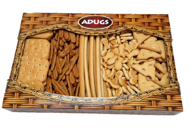 Krekeri asorti, kas sastāv no: krekera ar sipolu garšu, krekera "Rudzu standziņas", krekera “Jūras”, krekera “Saļie”, krekera ar siera aromātu.