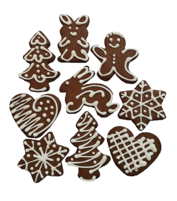 Ziemassvētku cepumi dažādas formas ar piparkūkām raksturīgu garšvielu garšu un aromātu, dekorēti ar cukura glazūru