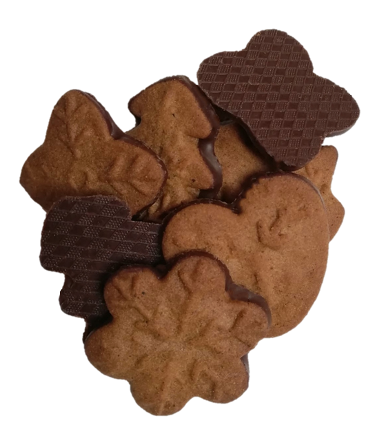Cepumi dažādu formu, ar garšvielu aromātu un garšu, brūnā krāsa, cepumu apakšā kakao glazūrā. Cietas struktūras.